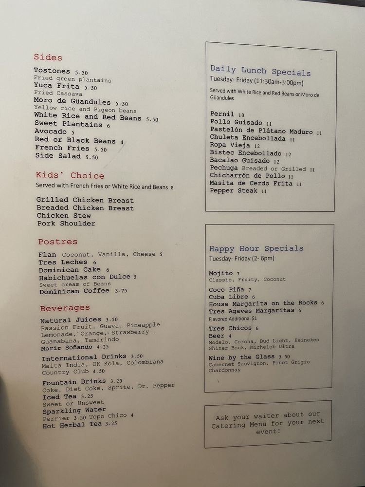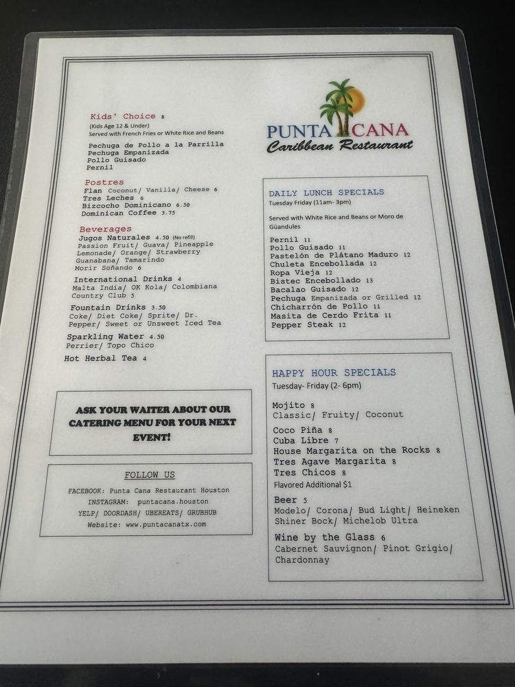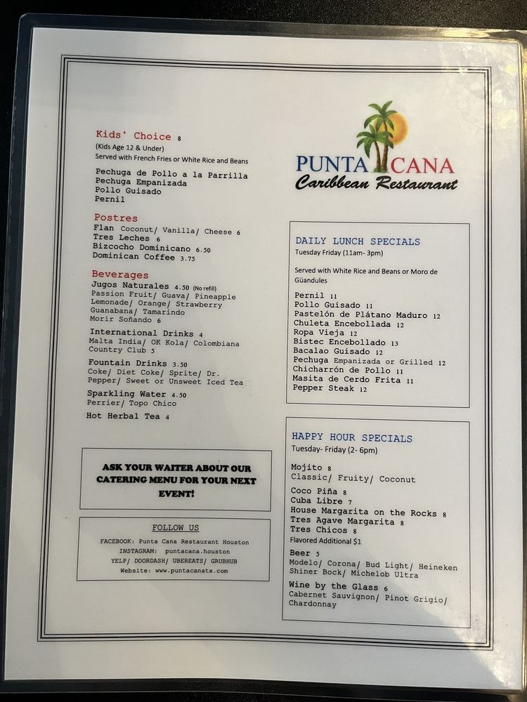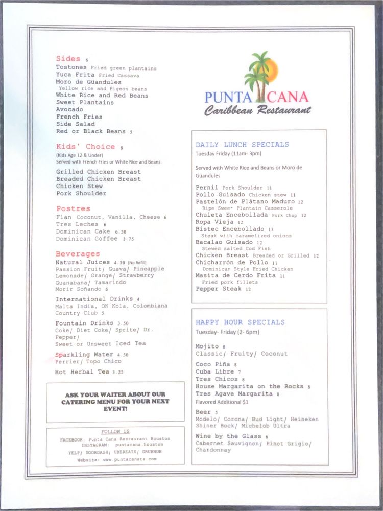 Introducing the menu at Punta Cana Caribbean Restaurant, a Puerto Rican and Dominican fusion with an emphasis on seafood. Located in Houston, TX, this restaurant offers a variety of amenities such as takeout, reservations, and wheelchair accessibility. Customers rave about the authentic flavors and generous portions, praising dishes like mofongo, tres leches cake, and chicharron de pollo. The cozy ambiance, friendly service, and extensive menu make Punta Cana a must-visit spot for those craving homemade Spanish cuisine. With reviews highlighting the attentive staff, delicious food, and vibrant Caribbean ambiance, this restaurant stands out for its flavorful dishes and welcoming atmosphere. From the flavorful stews to the crispy plantains, every bite at Punta Cana Caribbean Restaurant transports diners to the sunny shores of the Caribbean.